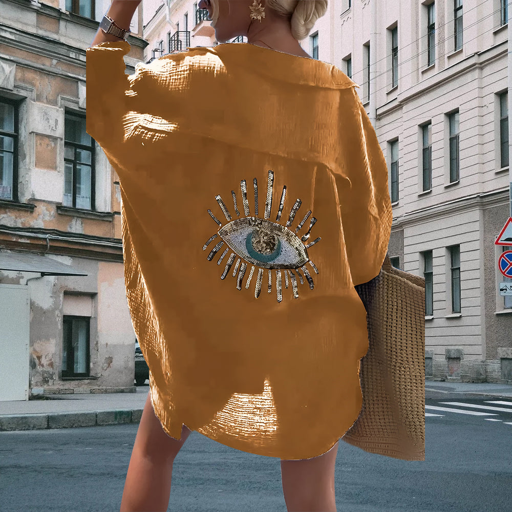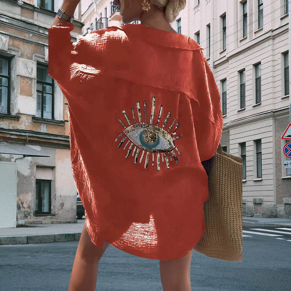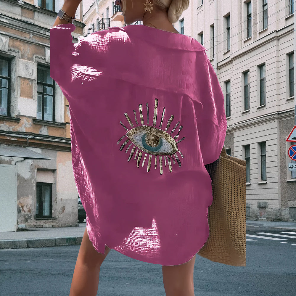 Introducing our captivating Evil Eye Casual Sequin Beaded Shirt, a mesmerizing blend of style and mystique. Crafted with meticulous attention to detail, this shirt is more than just apparel; it's a statement piece that exudes charm and personality. Adorned with intricate sequin and beadwork, each evil eye motif symbolizes protection and allure, making it a unique addition to any wardrobe.