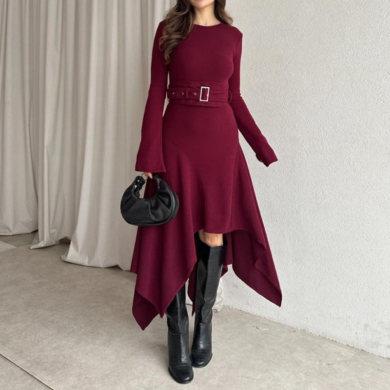 Modern Flared Sleeve Belted Asymmetrical Dress