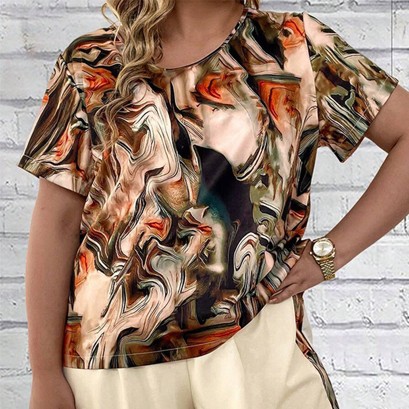 This stylish two-piece set features a print short sleeve tee and matching shorts, perfect for comfortable and fashionable summer style.