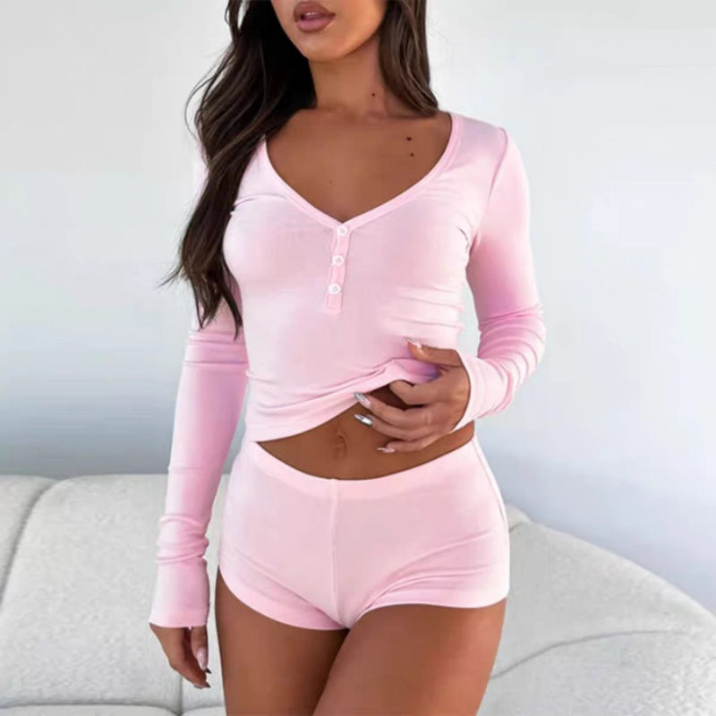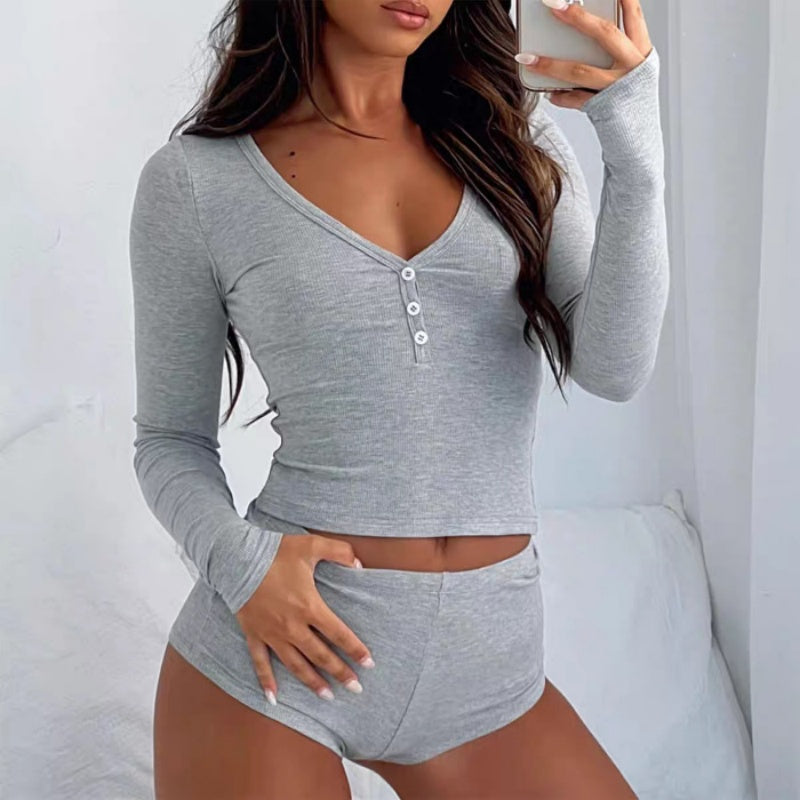 TWO-PIECE LOUNGE SET: This coordinated long-sleeve top and shorts set offers a chic, put-together look with zero effort. Wear them together for a complete outfit or mix and match with other wardrobe staples.